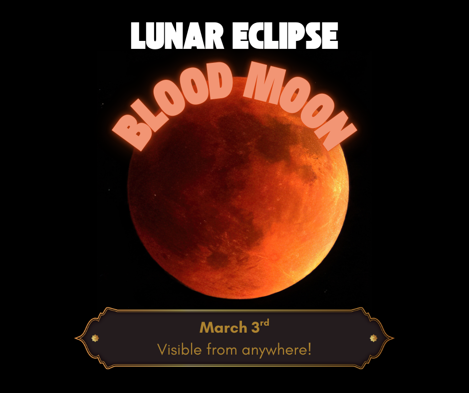 A very rare lunar eclipse (also known as a blood moon) will occur in the early morning hours of Tuesday, March 3rd. The best times to see the eclipse from St. Louis will be between 5:04 and 6:02 am. No special eyewear needed, as long as it's not too cloudy, you should be able to see it just fine from anywhere!